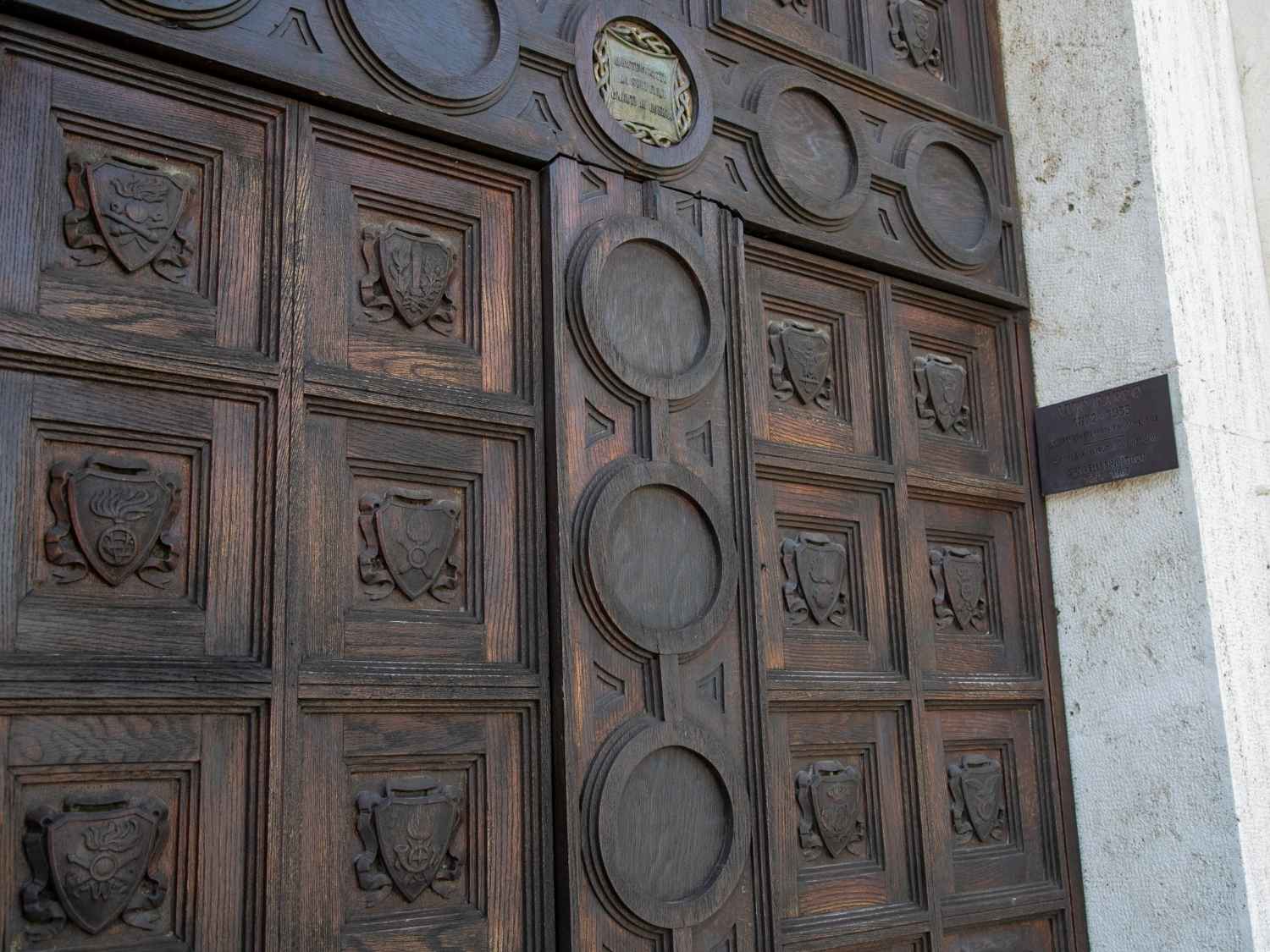 Parte integrante del monumento è il portone monumentale, di cui si conserva il disegno originale presso il Museo della “Mail Art”: esso è costituito da trentadue formelle che rappresentano gli stemmi delle Armi del Regio Esercito italiano, della Regia Marina e della Regia Aeronautica, intagliate a bassorilievo su legno di rovere, divise in quattro parti da una croce latina costituita da quattordici tondi. La formella centrale della croce è costituita da un tondo in ottone su cui è riportata la scritta “Montecarotto ai suoi figli caduti in guerra” contornata da una corona di nastri intrecciati.