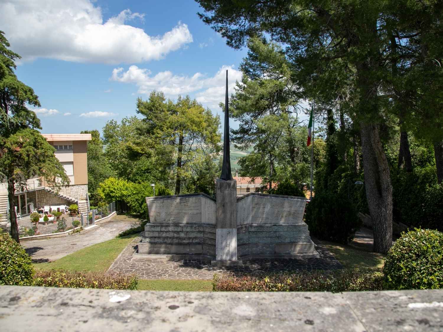 Lungo la scalinata, un cippo ricorda il luogo dove perse la vita il giovane Tarcisio Tassi, guida partigiana, caduto nel 1944 durante gli scontri della Battaglia di Montecarotto, una delle tappe fondamentali della liberazione della provincia di Ancona (25-30 luglio 1944), nella quale combatterono i partigiani locali, insieme ai patrioti della Brigata Maiella ed un distaccamento del Secondo Corpo d’armata polacco. Il monumento è raggiungibile da via XX Settembre mediante un’ampia scalinata lastricata che porta ad un’ara, sulla cui sommità spicca una stele di bronzo, poggiante su un parallelepipedo di travertino.