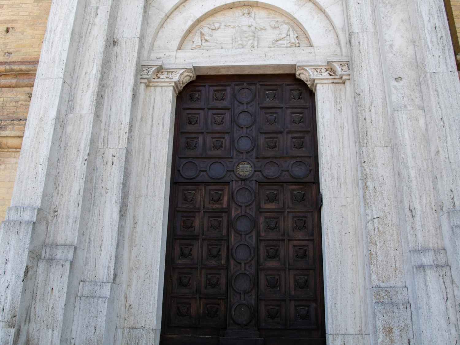 La lunetta posta sopra l’architrave del portale raffigura un santo in abito monastico, forse san Francesco, con le braccia aperte verso due soldati inginocchiati ai suoi lati, quello a sinistra sorregge una bandiera, quello a destra il fucile.