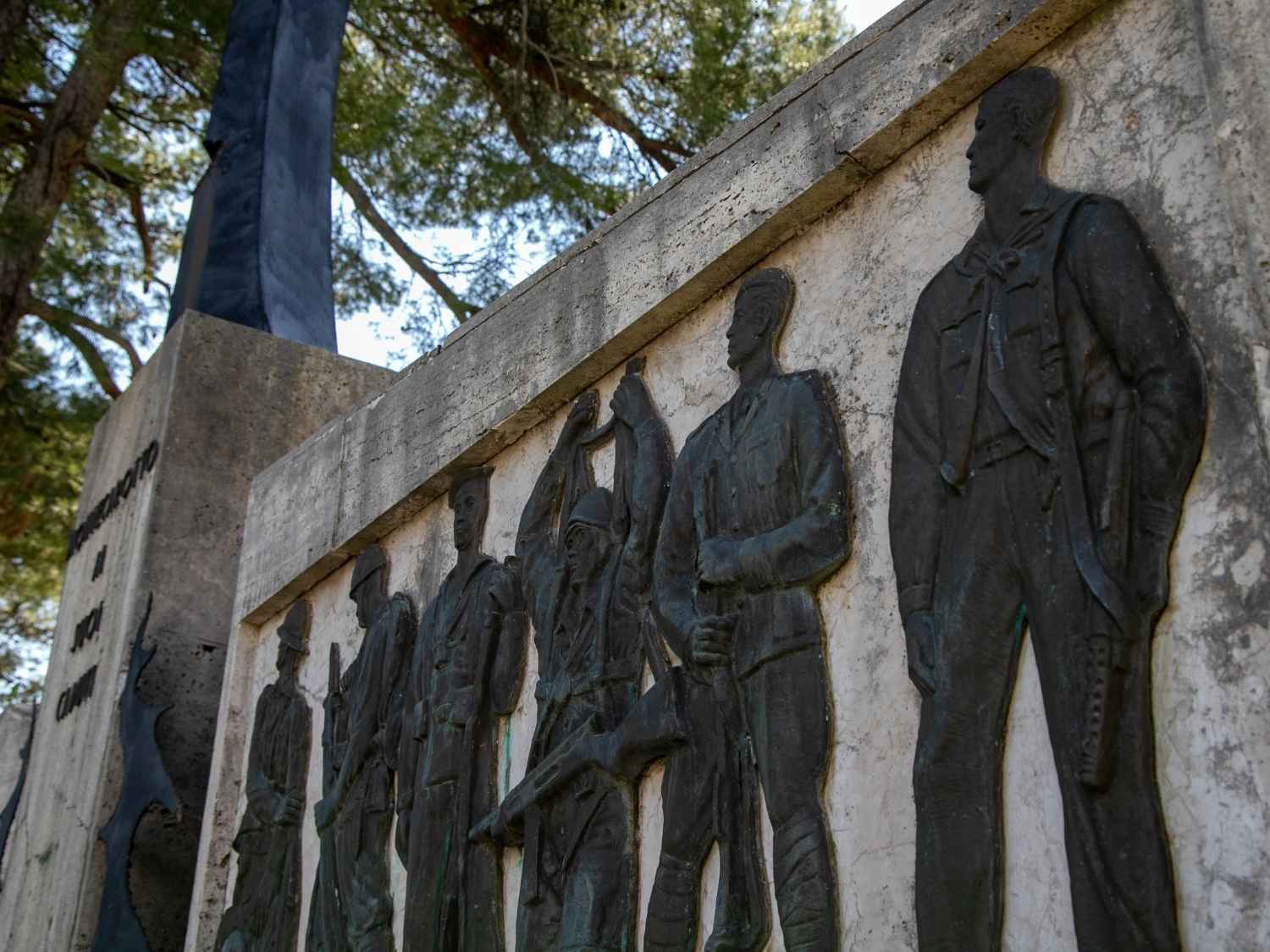 Ai lati dell’altare vi sono altri due volumi, sui quali poggiano dei pannelli in bronzo con rilievi stilizzati di combattenti, in memoria dei soldati italiani deceduti in battaglia. L’opera è stata realizzata su disegno del professor Schiavoni di Arcevia, che riprese l’idea originale di Vito Pardo, di costruire cioè una grande scalinata che abbracciasse la collina della chiesa di San Francesco.